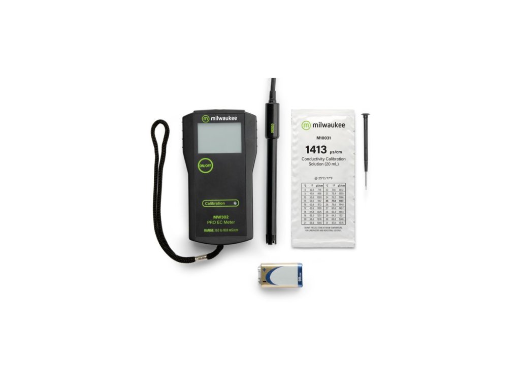 Jednoduchý měřící přístroj Milwaukee MW302 s podsvíceným displejem se ovládá pouze pomocí tří tlačítek. Tento digitální EC metr je určen pro měření elektrické vodivosti ve vodě, živných roztocích nebo jiných kapalinách. Vyměnitelná externí elektroda, sonda s DIN konektorem, je připevněna na metr dlouhém kabelu. Při poruše ji stačí vyměnit a nemusíte kupovat nový přístroj. Elegantní Standard Portable EC metr Milwaukee MW302 není vodotěsný. Oproti levným pH testerům je robustnější, spolehlivější, odolnější a déle vydrží.
