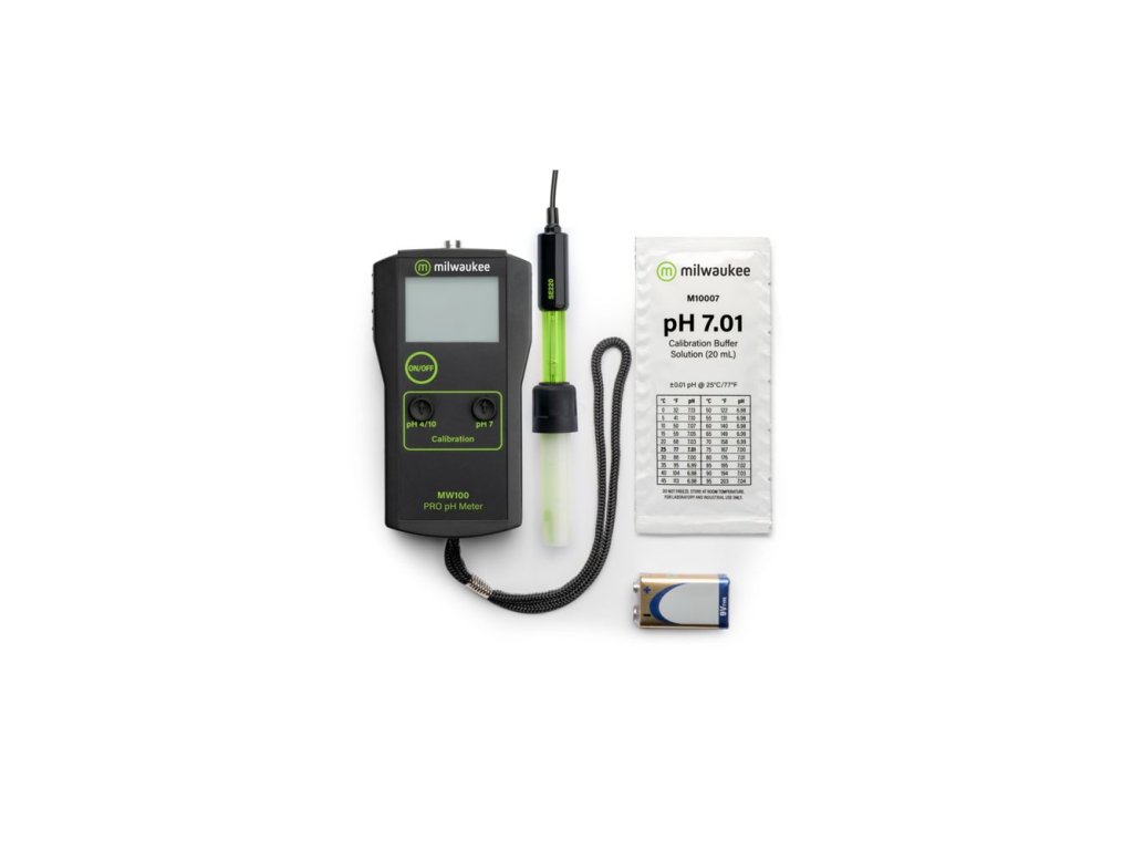 Jednoduchý a robustní měřící přístroj Milwaukee MW100 s podsvíceným displejem se ovládá pouze pomocí čtyř tlačítek. Spolehlivý pH metr je určen pro měření kyselosti a zásaditosti ve vodě, živných roztocích nebo jiných kapalinách. Vyměnitelná externí elektroda, sonda s BNC konektorem, je připevněna na metr dlouhém kabelu. Při poruše ji stačí vyměnit a nemusíte kupovat nový přístroj. Elegantní Standard Portable pH metr Milwaukee MW100 není vodotěsný. Oproti levným pH testerům je robustnější, spolehlivější, odolnější a déle vydrží.