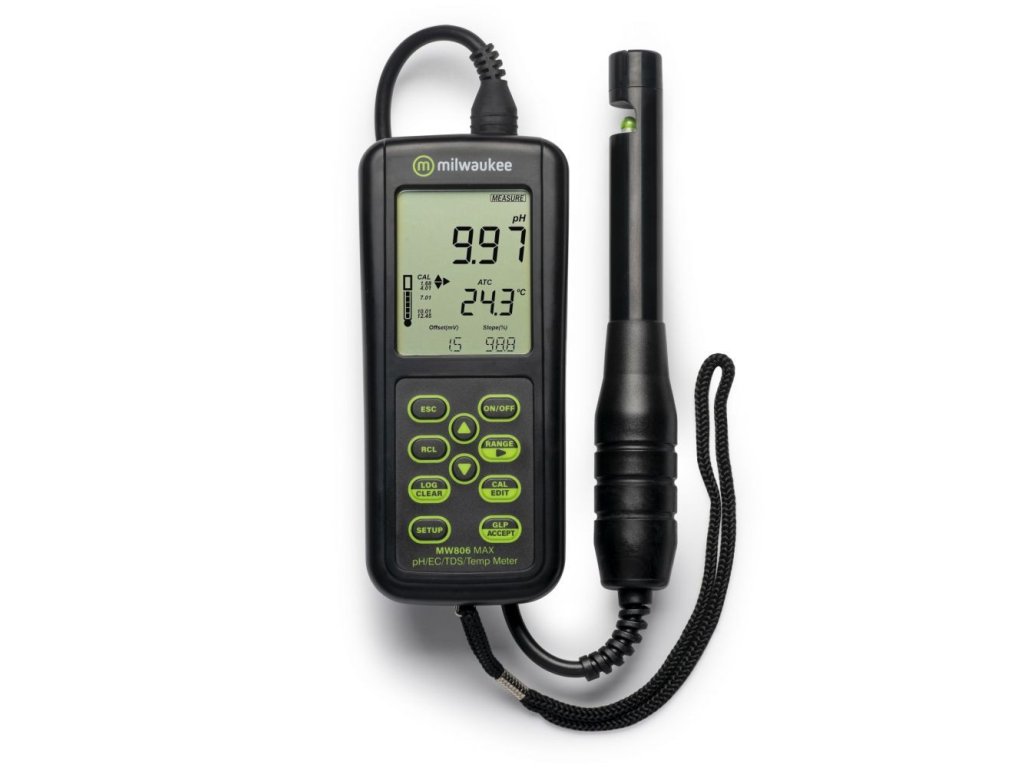Tento kombinovaný přístroj Milwaukee MW806 MAX pH/EC/TDS/Temp. 4 v 1 umožňuje měřit pH, EC (vodivost), TDS a teplotu pomocí jediného přístroje a jediné sondy.