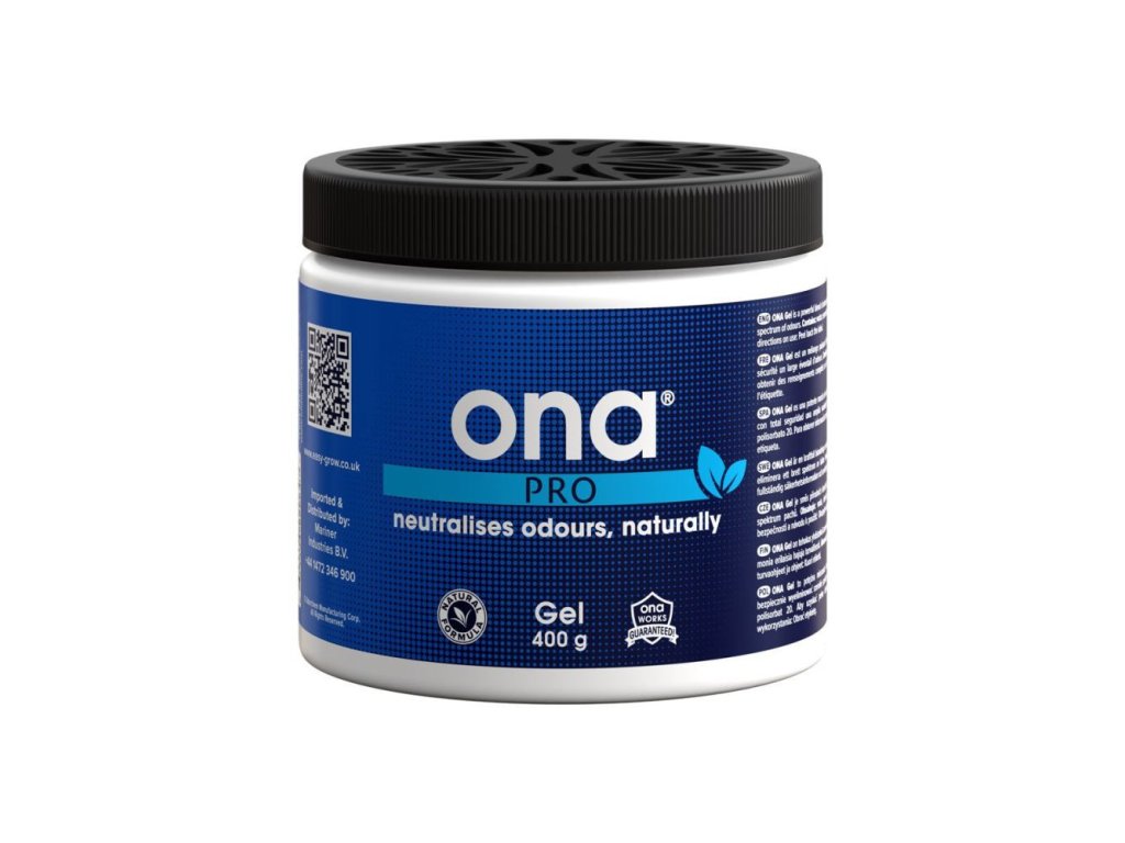 Na bázi přírodních terpenů vytvořený neutralizér v gelové podobě je účinným pomocníkem při boji s nepříjemnými pachy. Pohlcovač nejvyšší kvality, ONA Gel PRO, funguje rychle a spolehlivě, i proto patří mezi nejoblíbenější neutralizéry této kanadské značky. Díky přírodní bázi je vhodný i pro pěstitele aromatických bylinek.
