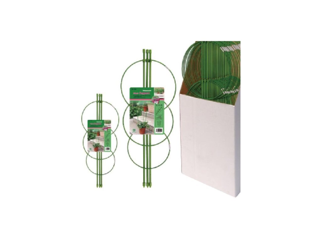 Tři tyčky a tři kulaté obruče se hodí hlavně pro pěstování venku. Opěrné kovové tyčky o délce 60 cm jsou potažené PE. Kruhová podpěra podporuje rovný a vzpřímený růst bylin a keřů.