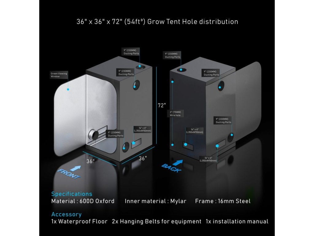 Pěstební stan VF 90, 90x90x180 cm s pevným a odolným rámem a vyztuženými plastovými rohy. Stan je vybaven 16mm tyčemi o tloušťce 0,8 mm. Kvalitní tkanina 600D Oxford. Vnitřní materiál Mylar fólie. 16mm tyče o tloušťce 0,8 mm. Vodotěsné dno a odnímatelná podlaha chrání před vytopením. 2 páry závěsných pásů pro zavěšení filtru s ventilátorem. Větrací otvor s vestavěnou síťkou proti škůdcům. Průmyslový zip pro vysoké zatížení. Vnitřní a vnější dvojité větrací uzavíratelné ponožky. Nosnost konstrukce 30 kg.