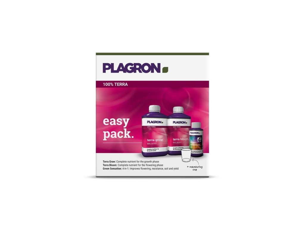 Balení Easy Pack 100% Terra obsahuje všechny živiny potřebné k pěstování až čtyř rostlin od začátku do konce. Závisí na velikosti květináče, četnosti zalévání a množství zálivky. Plagron Pack obsahuje minerální základní živiny pro fázi růstu a kvetení a top produkt 4 v 1 Green Sensation.
