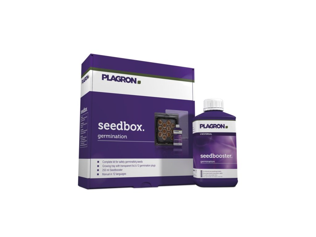 Sada Plagron Seedbox - kompletní kit pro klíčení semen s maximální úspěšností obsahuje speciální roztok Seedbooster, 12 sadbovacích válečků a plastový sadbovač.