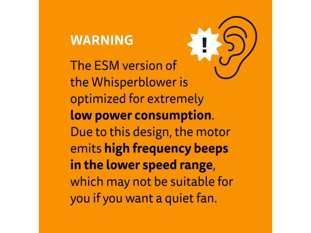 Pozor, ventilátor není optimalizován pro co nejnižší hlučnost, ale spotřebu! Při nižších otáčkách vydává vysokofrekvenční zvuk a proto není vhodný pro uživatele vyžadující maximálně tichý chod ventilace.