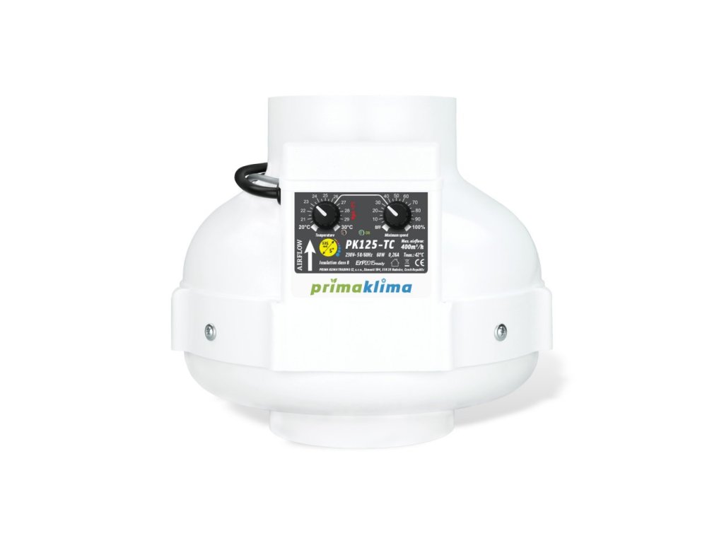 Radiální plastový ventilátor Prima Klima PK125-TC je určen pro vzduchová potrubí a pachové filtry o průměru 125mm. Přítahový nebo odtahový ventilátor disponuje teplotním čidlem na 4 metrovém kabelu. Senzor měří teplotu v místnosti. Jakmile teplota překročí nastavenou hodnotu, zrychlí se rychlost otáček. Když se teplý vzduch vyvětrá, vrátí se rychlost na nastavené minimum.