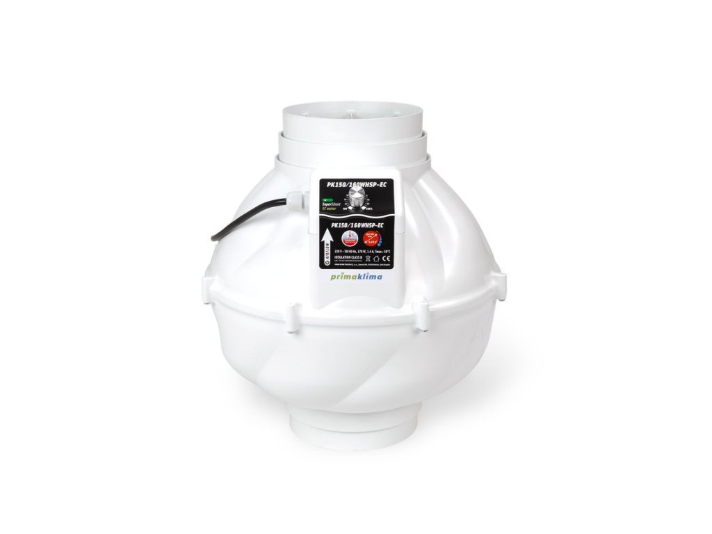 Jednorychlostní potrubní ventilátor s EC motorem Prima Klima Whisperblower Silenced EC Fan Dimmable disponuje maximálním průtokem vzduchu 1400 m3/h. Dvě možnosti připojení 150-160 mm.