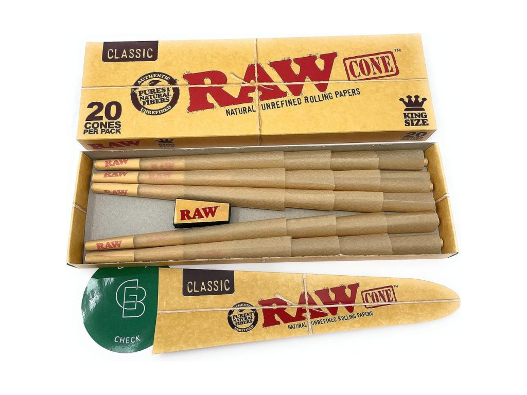109 mm dlouhé, nebělené a pomalu hořící předbalené dutinky RAW Cones King Size jsou k dispozici v balení po 20 kusech.