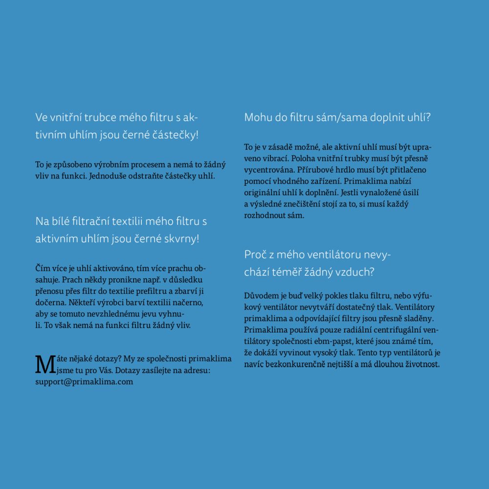 Nejčastější otázky o pachových filtrech s aktivním uhlím od Prima Klima najdete s odpověďmi ve fotogalerii.