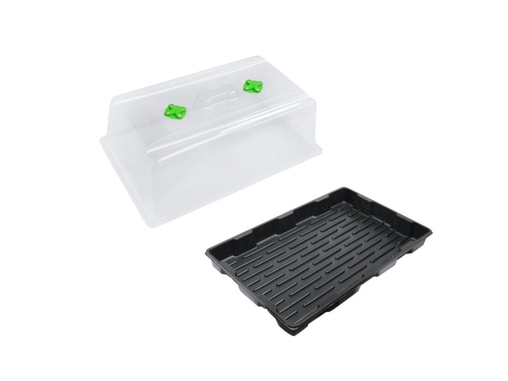 Plastový skleníček pro předpěstování sazenic se skládá ze spodního černého podnosu o rozměrech 57x35.5x5.5 cm a horního víka 57x37x15 cm. Víko je vybaveno ventilačními klapkami.