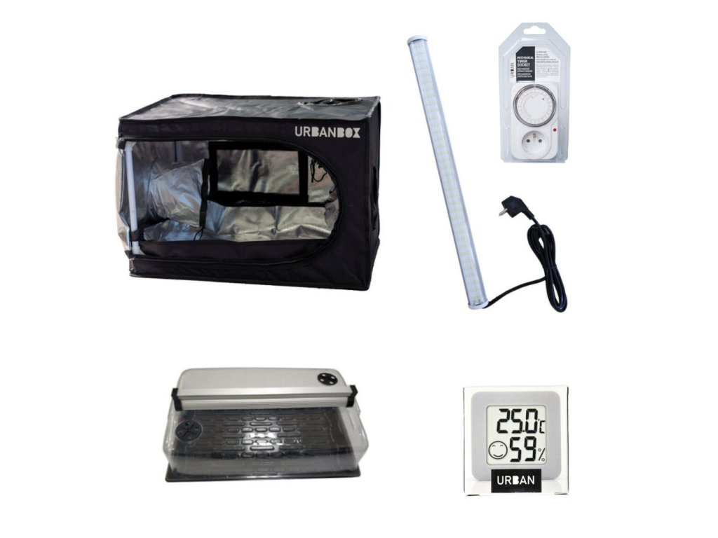Komplet pro výsadbu nebo klonování zahrnuje stan URBANBOX Propagator 60, 60x40x40 cm, GENT G-LED svítidlo 26W s integrovaným kabelem, GENT skleník s prolisem a rozměry 58x37x22 cm, mechanické spínací hodiny a měřič teploty a vlhkosti Urban.