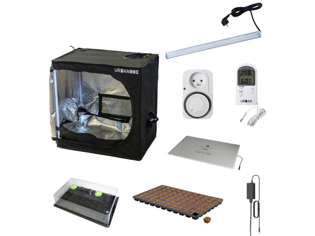 Pokročilý sadbovací komplet Urban Propagation Medium tvoří malý stan s pěstební plochou 60x40 cm a výškou 60 cm, 1x LED osvětlení se spektrem podporujícím růst, 1x plastový skleníček, 1x sadbovací médium, 1x výhřevnou podložku se zdrojem k zapojení, 1x mechanické spínací hodiny, 1x digitální měřič teploty a vlhkosti se sondou. Vše pro dokonalé předpěstování sazenic a řízků.