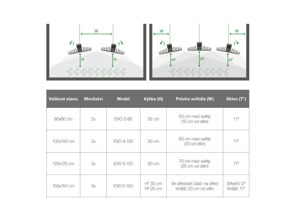 - Při indoor pěstování v grow boxech se doporučuje svítidla zavěšovat v mírném sklonu (11°).
