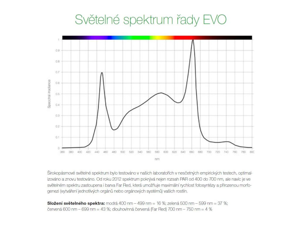 U řady EVO se pro dokonalé světelné spektrum s výjimečnou účinností kombinuje špičkové červené světlo Osram UX3 High-Power s nejúčinnějšími bílými LED diodami od společnosti Seoul.