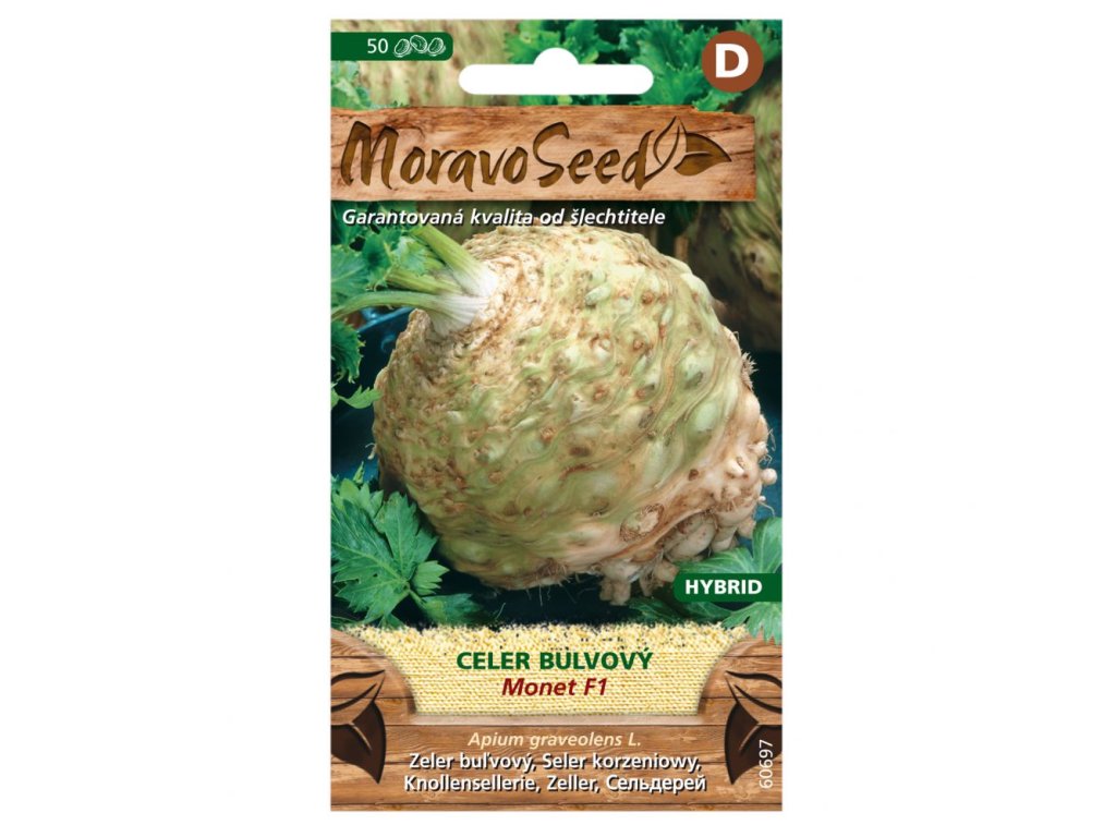 Raná, vysoce výnosná odrůda celeru se pěstuje kvůli nati nebo bulvě. Je odolná proti septorióze a vybíhání do květu. Semena celeru bulvového Monet F1 od Moravo Seed obsahuje 50 semínek. Vegetační doba pro sklizeň natě je cca 90 dní, pro skladování kořene až 135 dní.