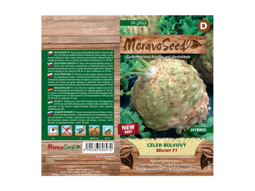 Semena celeru bulvového Monet F1 od Moravo Seed obsahuje 50 semínek. Vegetační doba pro sklizeň natě je cca 90 dní, pro skladování kořene až 135 dní.