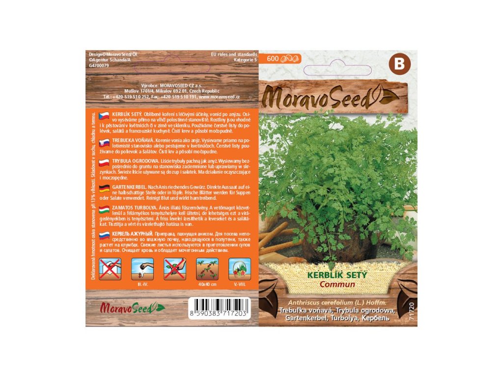 Balení semínek kerblíku setého obsahuje 600 semen. Čerstvý kerblík je možné pěstovat i v zimě v skleníku, stačí mu vlhčí polostinné stanoviště.