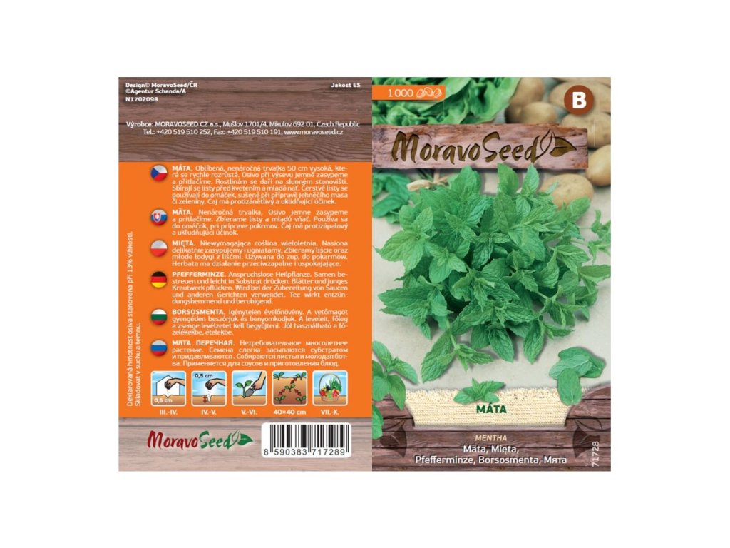 Balení semínek Máty peprné obsahuje 1000 semen. Aromatická a nenáročná trvalka Máta peprná, mentha, má ráda hodně sluníčka. Nať i listy se využívají čerstvé i sušené.