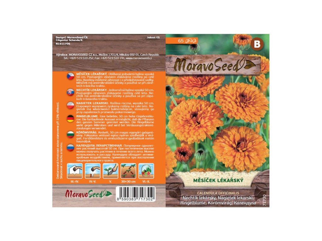 Balení semínek Měsíčku lékařského obsahuje 65 semen. Měsíček, Calendula officinalis, je jednoletá léčivá bylinka s krásnými oranžovými květy. Roste až do výšky 50 cm.