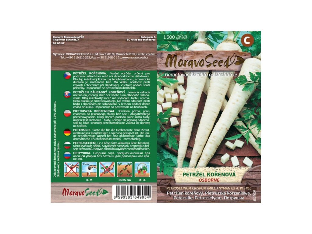Balení semen petržele kořenové Osborne od Moravo Seed obsahuje 1500 semínek. Vyznačuje se aromatickou vůní a mléčnou barvou kořene.
