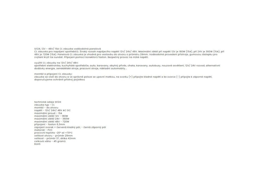SI124 12V-24V-48V CL 15A zásuvka voděodolná panelová pro napájení elektrospotřebičů. Montáž do otvoru 29 mm. Připojení konektory faston. Maximální zátěž 180W (15A).