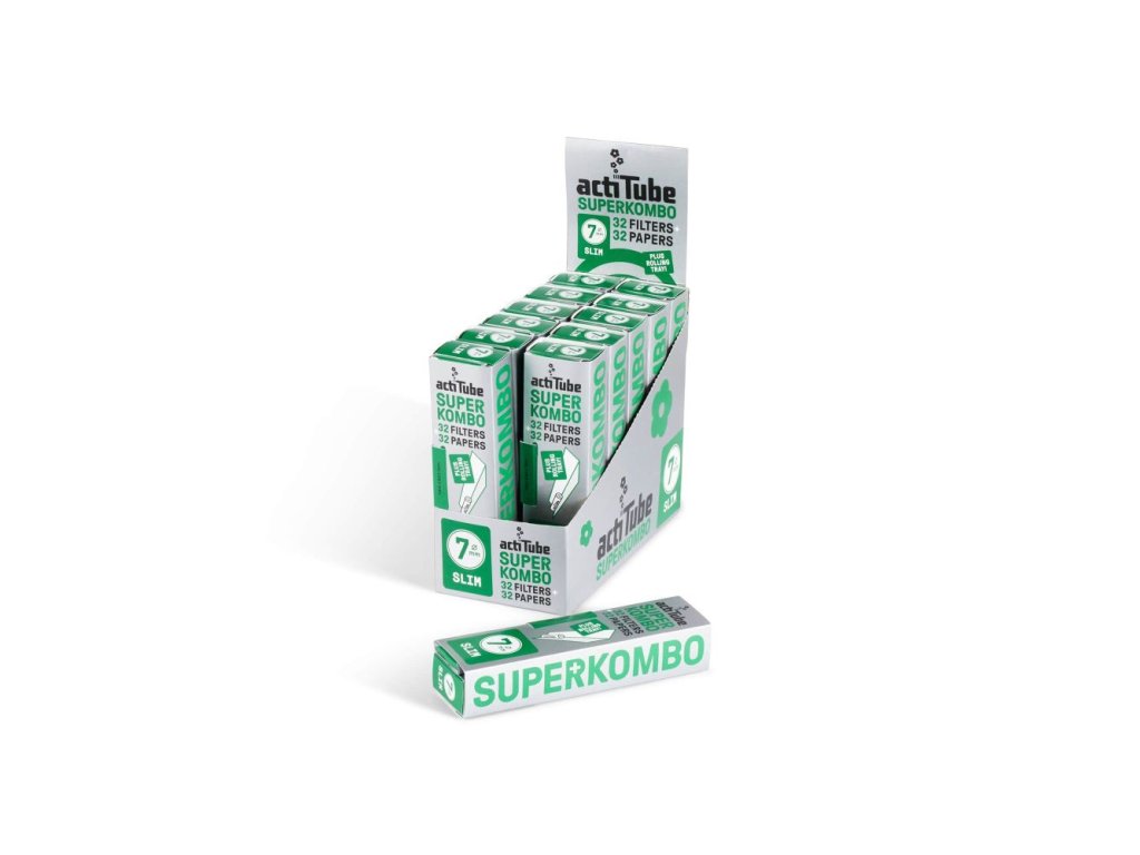 Kombinované balenie ActiTube Slim 7mm Superkombo obsahuje 32 filtrov a 32 papierikov. Praktická sada všetko v jednom pre formát Slim.