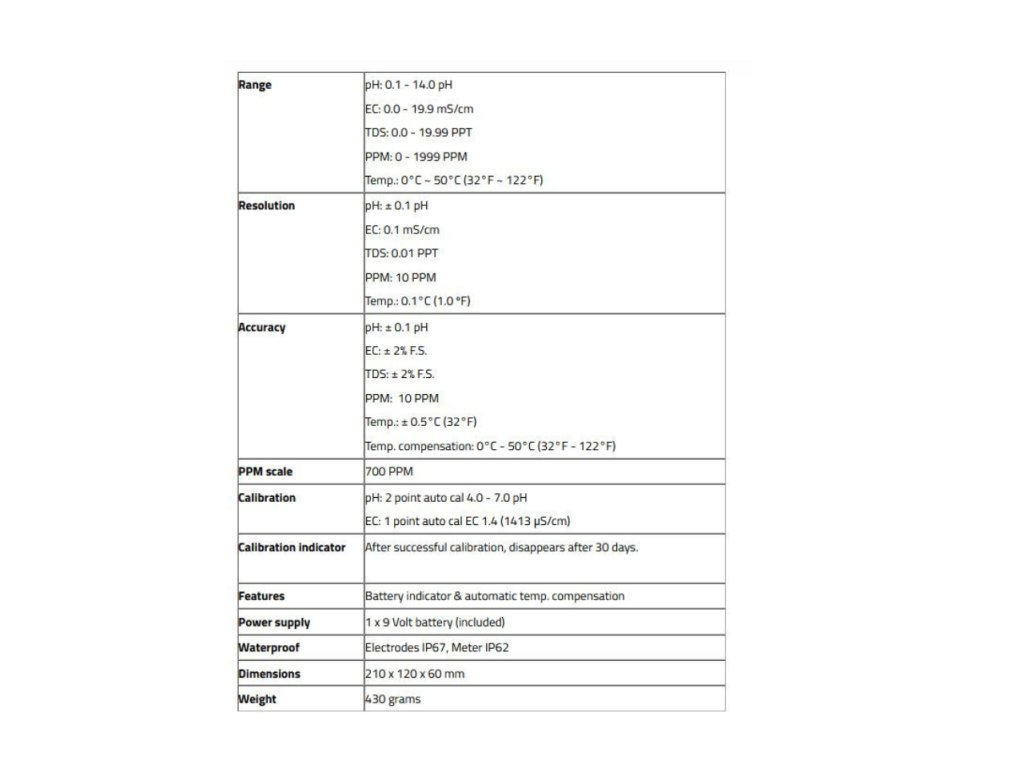 • Rozsah merania: pH 0,1 – 14,0; EC 0,0 – 19,9 mS/cm; TDS 0,0 – 19,99 PPT; PPM 0 – 1999; Teplota 0 °C – 50 °C.