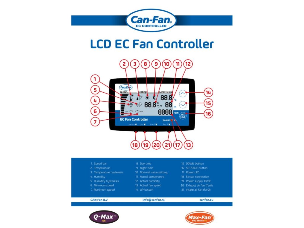 Multifunkčný a absolútne spoľahlivý regulátor je určený len pre kanálové ventilátory Can-Fan s EC motorom (série Q-Max EC a Max-Fan EC). Automatické ovládanie vám pomôže vytvoriť produktívne prostredie v každom ohľade. Vysoko sofistikovaný ovládač Can-Fan EC LCD má veľký a prehľadný displej a ľahko sa ovláda. Hlavnou výhodou automatickej regulácie je, že bylinky budú mať optimálne podmienky bez výkyvov teploty alebo vlhkosti aj počas vašej neprítomnosti.