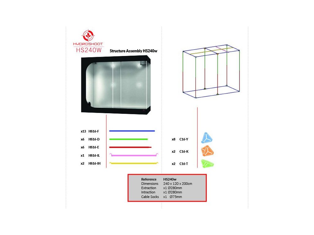 Pestovateľský stan Hydro Shoot HS240W vo verzii R2.00 predstavuje spoľahlivé riešenie pre indoor pestovanie. Plášť stanu je vyrobený z odolného materiálu 210D Strong Mylar Fabric, ktorý zaisťuje dlhú životnosť a efektívnu odrazivosť. Pevnosť celej zostavy garantuje robustná konštrukcia z ocele Q195 Steel s tyčami s priemerom 19 mm, ktoré sú spojené 4mm polypropylénovými spojkami.