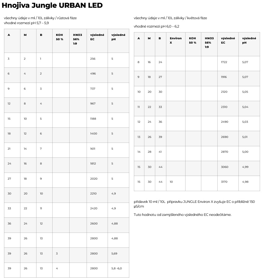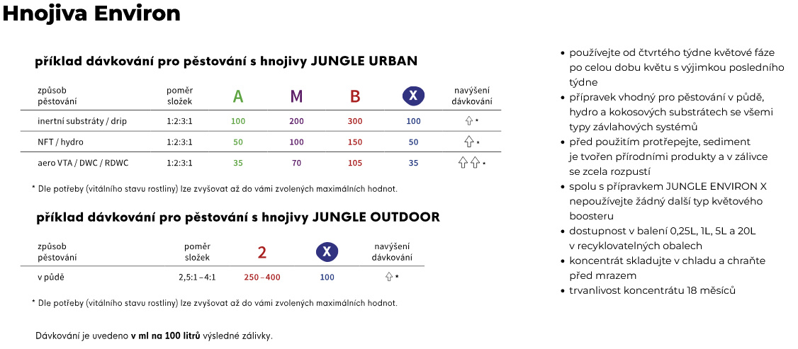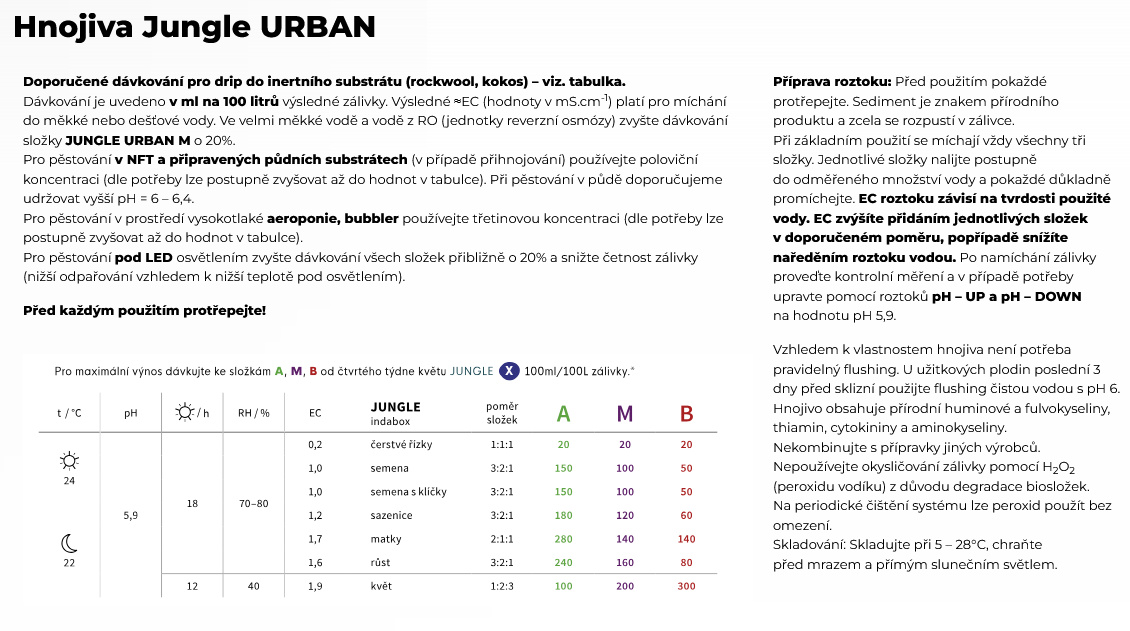 Trojzložkový rad Urban (A, B, Mikro) je určený na indoor pestovanie byliniek doma. Po celú dobu pestovania používate všetky tri fľaše, len koncentrácia sa mení. Oproti tomu, rad Outdoor je prispôsobený na kultiváciu rastlín pod holým nebom v miernom stredoeurópskom podnebí. Outdoor 1 sa používa v rastovom, Outdoor 2 v kvetovom období. Kvetový stimulátor Jungle indabox Environ X s novou receptúrou obsahuje prírodné makromolekulárne látky s enzýmami, humínovými a fulvickými kyselinami. Masívne podporuje rozkvet, hustotu a veľkosť kvetov alebo plodov. Je kompatibilný so všetkými pestovateľskými metódami, vrátane kvapkovej závlahy. Pre začínajúcich pestovateľov je najjednoduchšou možnosťou vyskúšať niektorú zo zvýhodnených sád hnojív Jungle in da box Starterpack. Súčasťou ponuky je aj servisná chémia na úpravu pH.