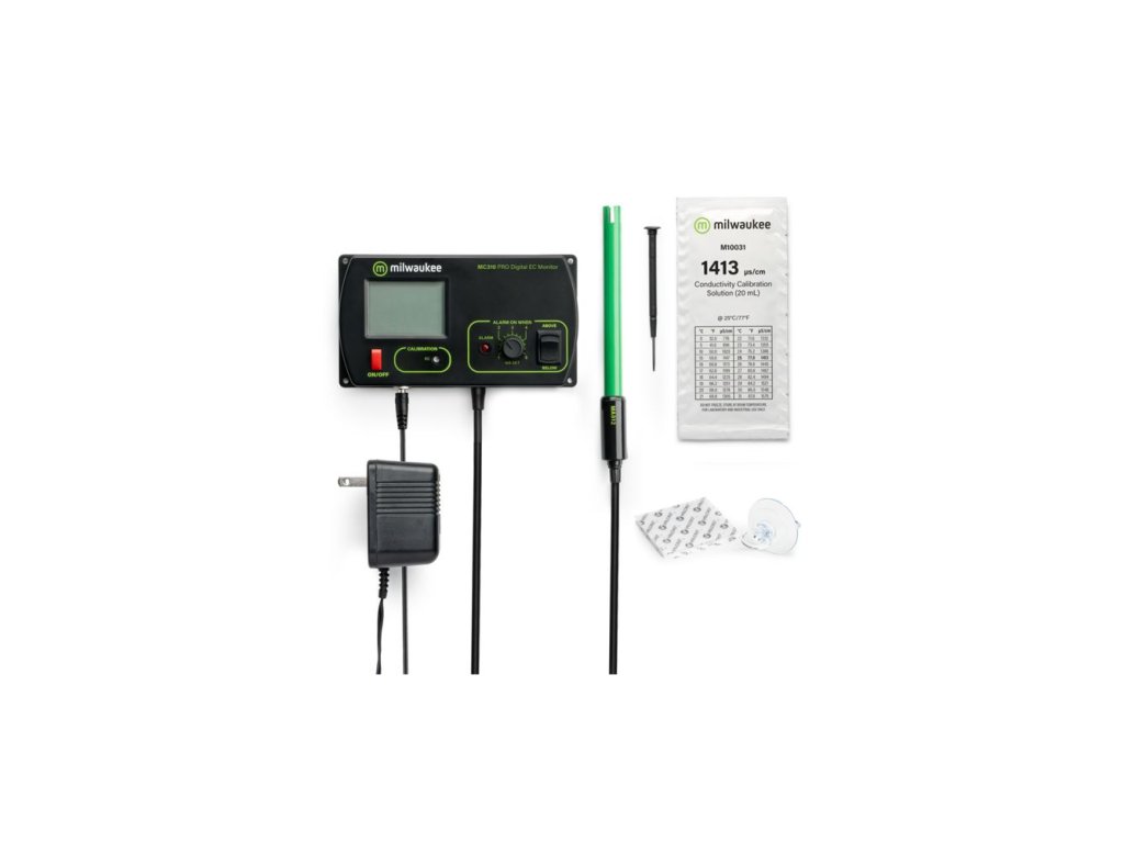 Sofistikovaný merací prístroj EC je vybavený vymeniteľnou sondou MA812B/2 s dvojmetrovým káblom a konektorom BNC. Digitálny inteligentný monitor EC Milwaukee MC310 nepoužíva na napájanie batérie, ale sieťové pripojenie 12 V. Samozrejmosťou je veľký a prehľadný displej. Tento profesionálny digitálny merač elektrickej vodivosti je vhodný pre pestovateľov a akvaristov.