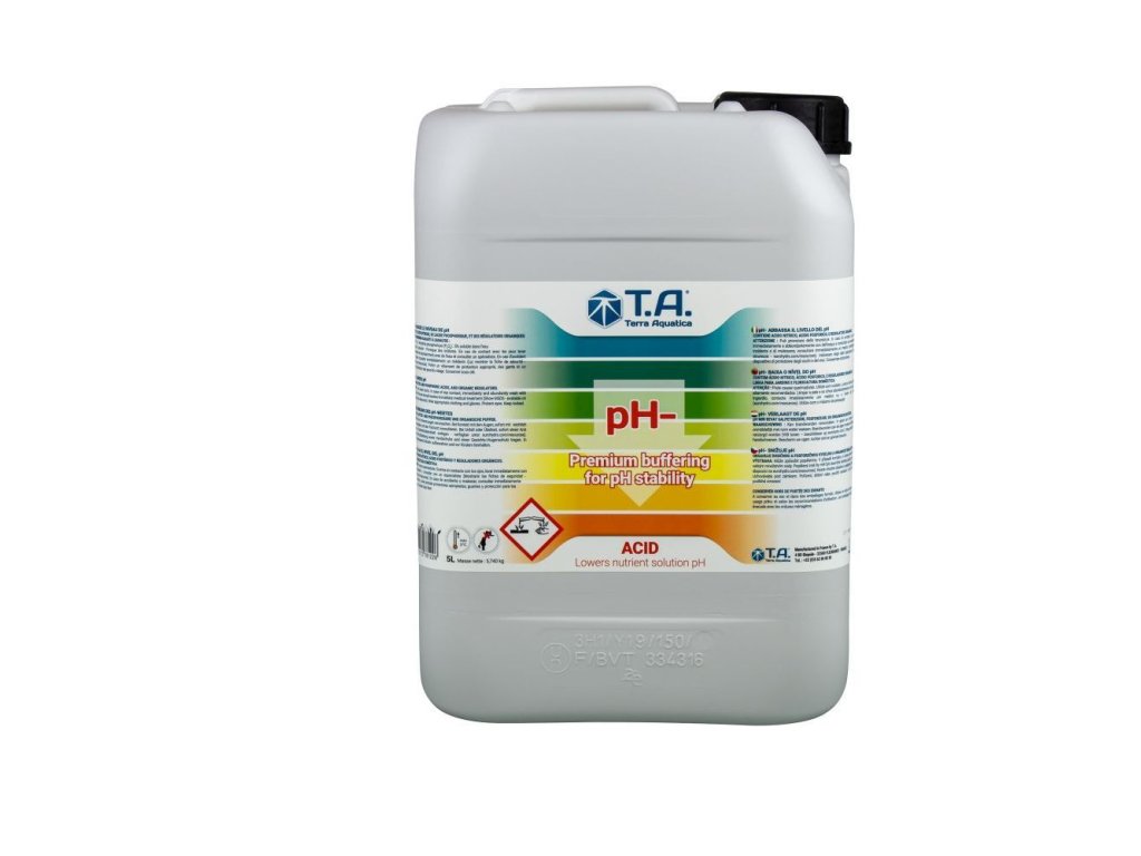 Výrobok na reguláciu pH obsahuje kyselinu fosforečnú, dusičnú a citrónovú. Pomáha regulovať nadbytok vápnika pri pestovaní s tvrdou vodou, nenarušuje pomer dusíka a draslíka a nezanecháva v nádrži žiadne usadeniny. univerzálny regulátor pH pH mínus (predtým GHE pH Down) je vhodný na reguláciu živných roztokov pri pestovaní v pôde, kokose alebo inertných substrátoch.
