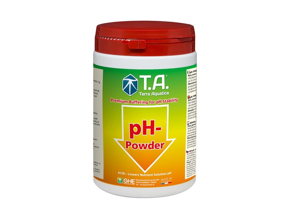 Rastlinám dodáva rast stimulujúce dusičnany a fosfáty, ktoré sú prospešné pre kvitnutie. Vo vysokých koncentráciách sa Terra Aquatica pH - 5 kg môže používať ako čistič systému a zavlažovacích trubíc. V nízkej koncentrácii sa používa ako listový čistiaci postrek. univerzálny regulátor pH mínus (predtým GHE pH Down) je vhodný na reguláciu živných roztokov pri pestovaní v pôde, kokosových alebo inertných substrátoch.