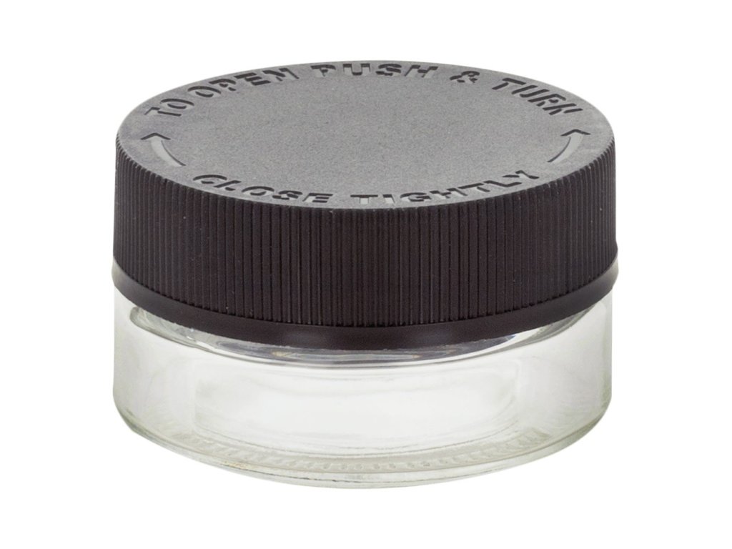 Průhledná sklenice se šroubovacím černým víkem Qnubu California Safe Pack pomáhá s bezpečným skladováním bylinek a potravin. Kvalitní borosilikátové sklo. Objem 30 ml.
