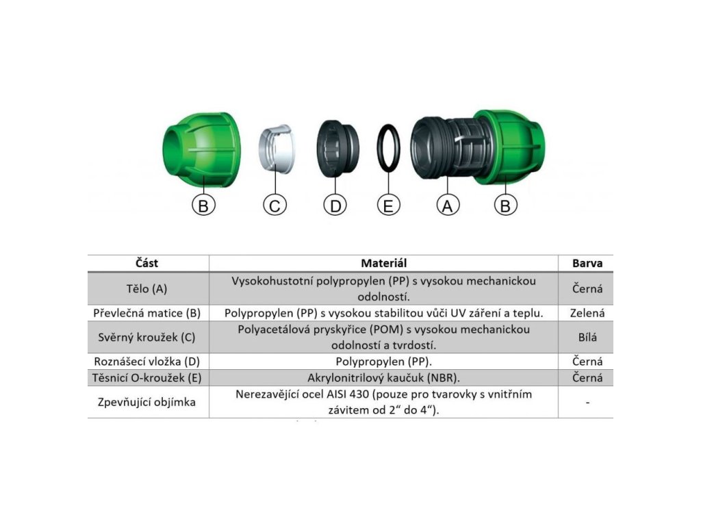 Mechanické spojování potrubních rozvodů závlahových systémů z nízkohustotního (PE-LD/ES) a středněhustotního (PE-MD) polyetylénu v jednovrstvém nebo dvouvrstvém (PE-MD / PE-LLD) provedení. U systémů bez tlakových rázů lze použít i na vysokohustotní flexibilní polyetylén (PE-HD, PE 80).