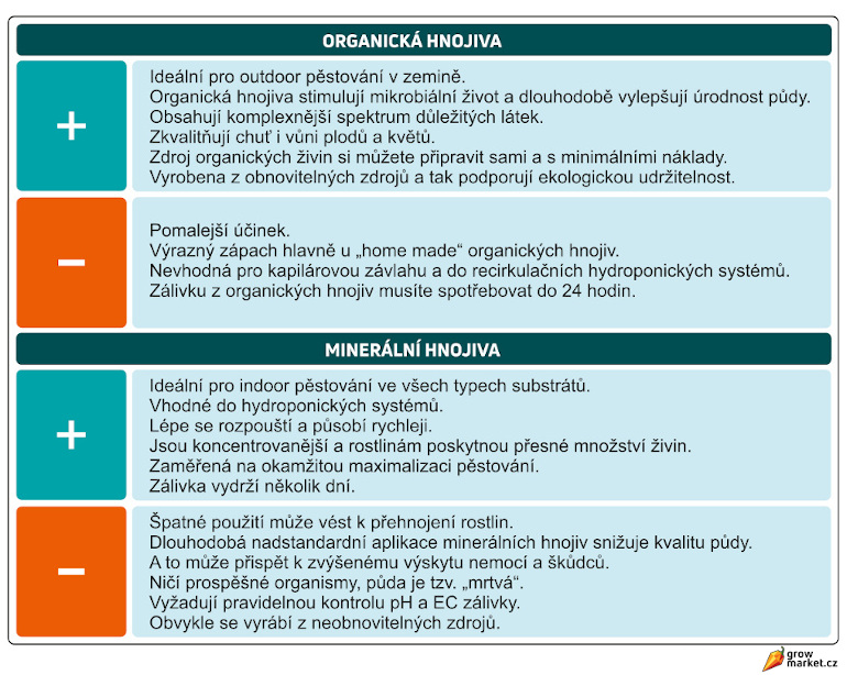 Podrobný přehled živin a detailní srovnání druhů a typů hnojiv najdete v článku Jak vybírat hnojiva na outdoor pěstování.