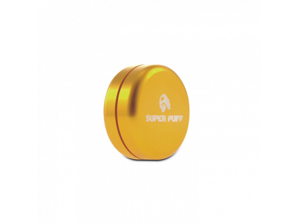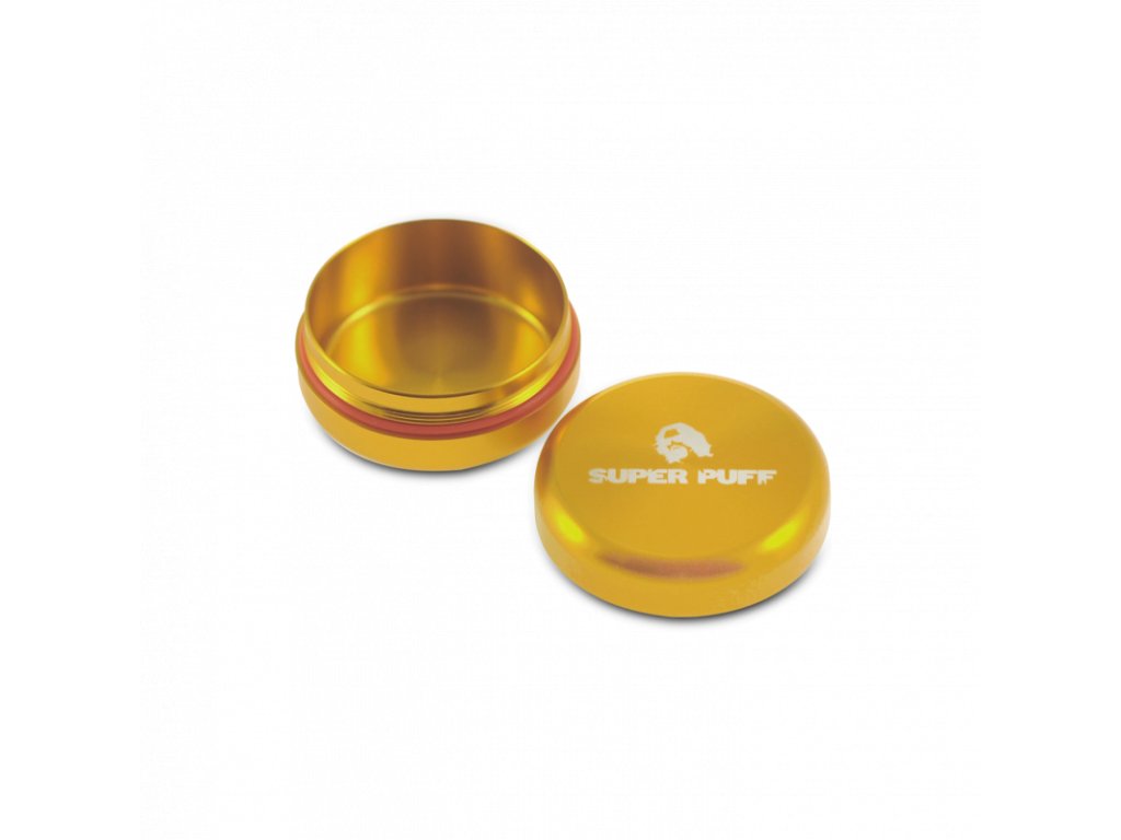 Hliníková krabička o objemu 35 ml a průměru 5 cm od značky Super Puff. Tato firma je sesterskou odnoží známé holandské seedbanky Super Strains Seeds.