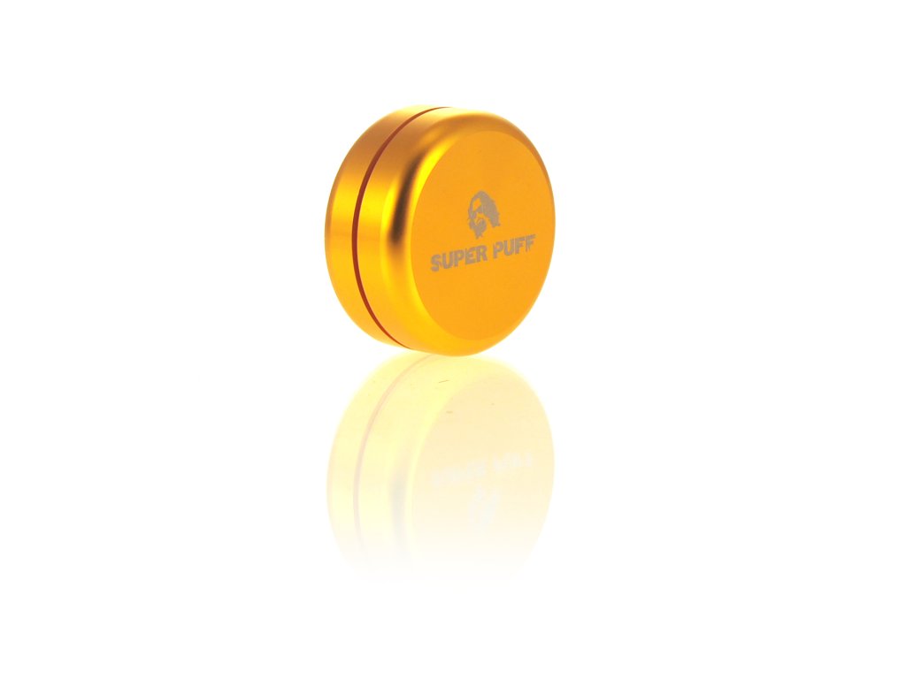 Hliníková krabička o objemu 35 ml a průměru 5 cm od značky Super Puff. Tato firma je sesterskou odnoží známé holandské seedbanky Super Strains Seeds.