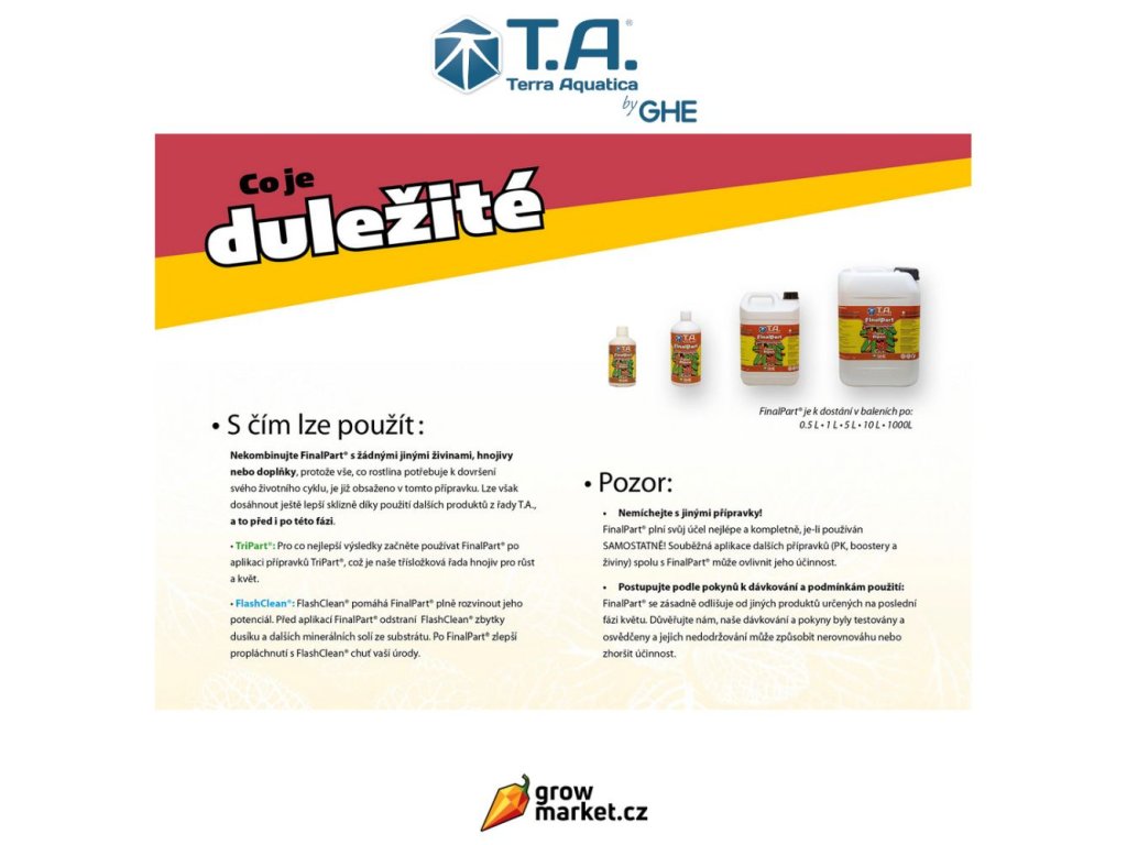 Stimulátor dozrávání FinalPart 500 ml je dobře rozpustný a rostlinou snadno vstřebatelný. Při outdoor pěstování bylinek pomáhá urychlit sklizeň dřív, než bude ohrožena plísní. Při pěstování rostlin pod umělým osvětlením harmonizuje závěrečnou fázi a razantně přispívá k vyšší kvalitě sklizně. Nevyžaduje žádné další doplňky, ale na vyplavení přebytečných živin použijte průplachový přípravek T.A. FlashClean.