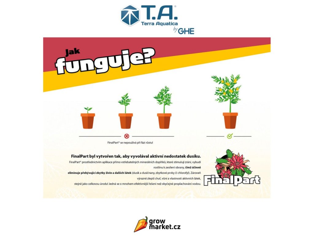 Průplachový přípravek Terra Aquatica FlashClean 5 l velice efektivně rozpouští nahromaděné soli. Vyplachuje přebytečné látky a dodatečně vyživuje rostliny. Současně vyživuje mikroorganismy i regeneruje půdní a kokosové substráty. V kombinaci s Terra Aquatica FinalPart maximalizuje sklizeň květů nebo plodů a vylepšuje jejich vůni i chuť.Usazování minerálních solí může způsobit poruchy příjmu živin, poškození kořenů i zanesení zavlažovacího systému. Flexibilní FlashClean nefunguje na enzymové bázi.