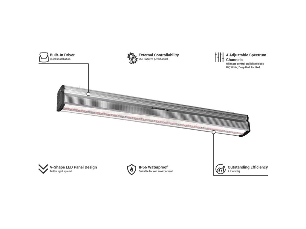 ThinkGrow Model-I plus LED Grow Light 720W, 2,7 μmol/J je vysoce výkonné LED světlo pro pěstování v zahradnictví. Kompaktní konstrukce s vestavěným ovladačem vyvažuje energetickou účinnost a pracovní prostředí člověka. Inovativní konstrukce ve tvaru písmene V na panelu LED zlepšuje distribuci světla, což snižuje potřebnou výšku od koruny stromu, protože snižuje ztráty světelné energie. Čtyři kanály spektra včetně UV, bílého, sytě červeného (deep red) a dálkově červeného (far red) jsou plně ovladatelné a umožňují zvolit přesný recept světla, které vaše rostliny potřebují (v kombinaci s řídicí jednotkou TrolMaster HCS-2/3). Poskytuje skvělou možnost externího ovládání a umožňuje zapojit až 256 svítidel na kanál s vynikající účinností 2,7 μmol/J. Obsah balení: 1x Model-I Plus LED, 1x 12' napájecí kabel 240V, 1x 16ft 4kolíkový vodotěsný prodlužovací kabel Y-splitter. Specifikace: Vnitřní rozvodná jednotka s konektorem pro zásuvku: PPF: >1944 μmol/J.Vstupní výkon: 720 W. Výkonový faktor: 7,5 mm: >=96%. Montážní výška:: >cca 75 cm nad canopy. Životnost: L90>54000 hodin. Automatická detekce vstupního napětí: 100-277V. BTU: 2456,74 btu/h. Rozměry: 1149x111x164 mm. Hmotnost: 10 kg.