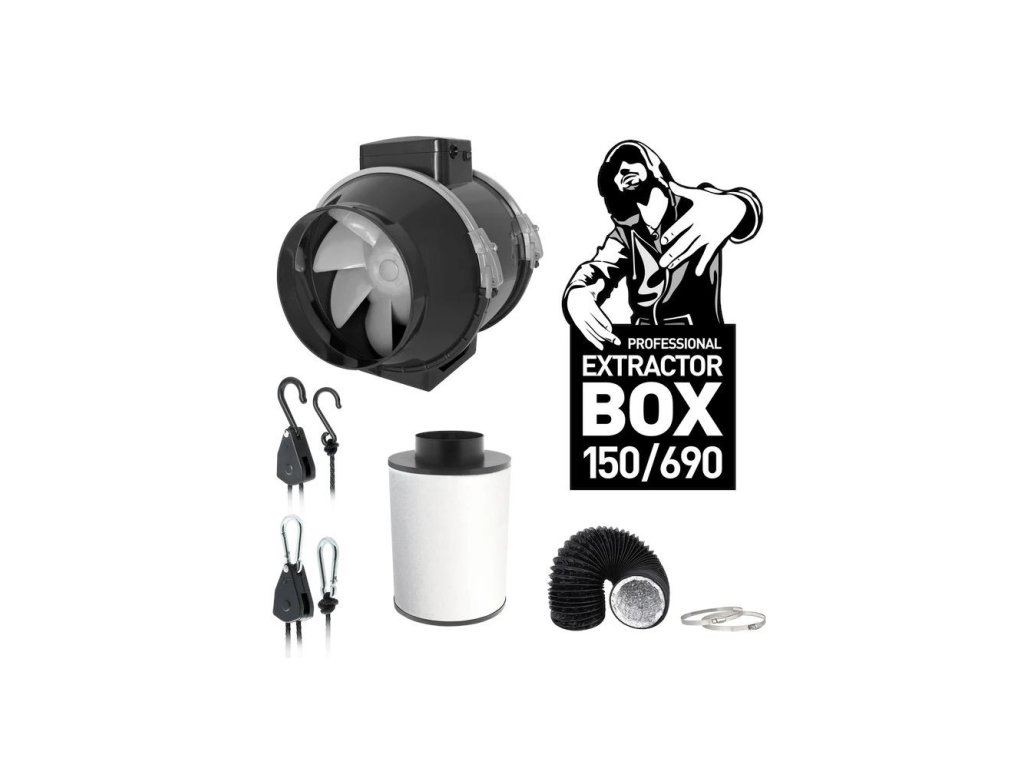 Kompletní set ventilace Trafika KIT Extractor s průměrem 150 mm obsahuje vše potřebné pro odvětrávání středních grow boxů: axiální TT ventilátor 405-520 m3/h s kabelem, pachový filtr 690 m3/h, 5m vzduchové potrubí typ COMBI, stahovací pásky a závěsy.