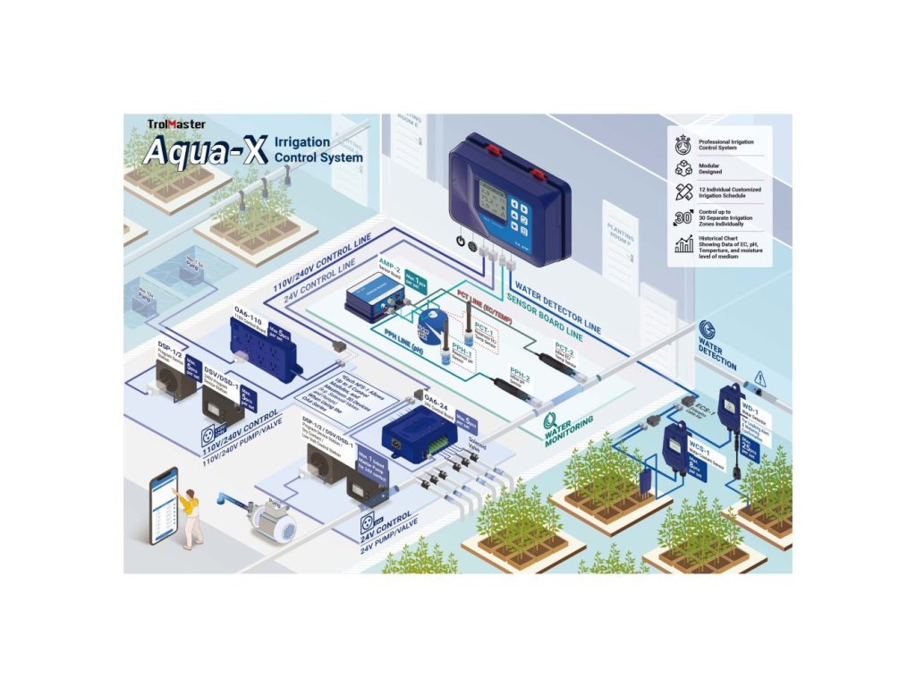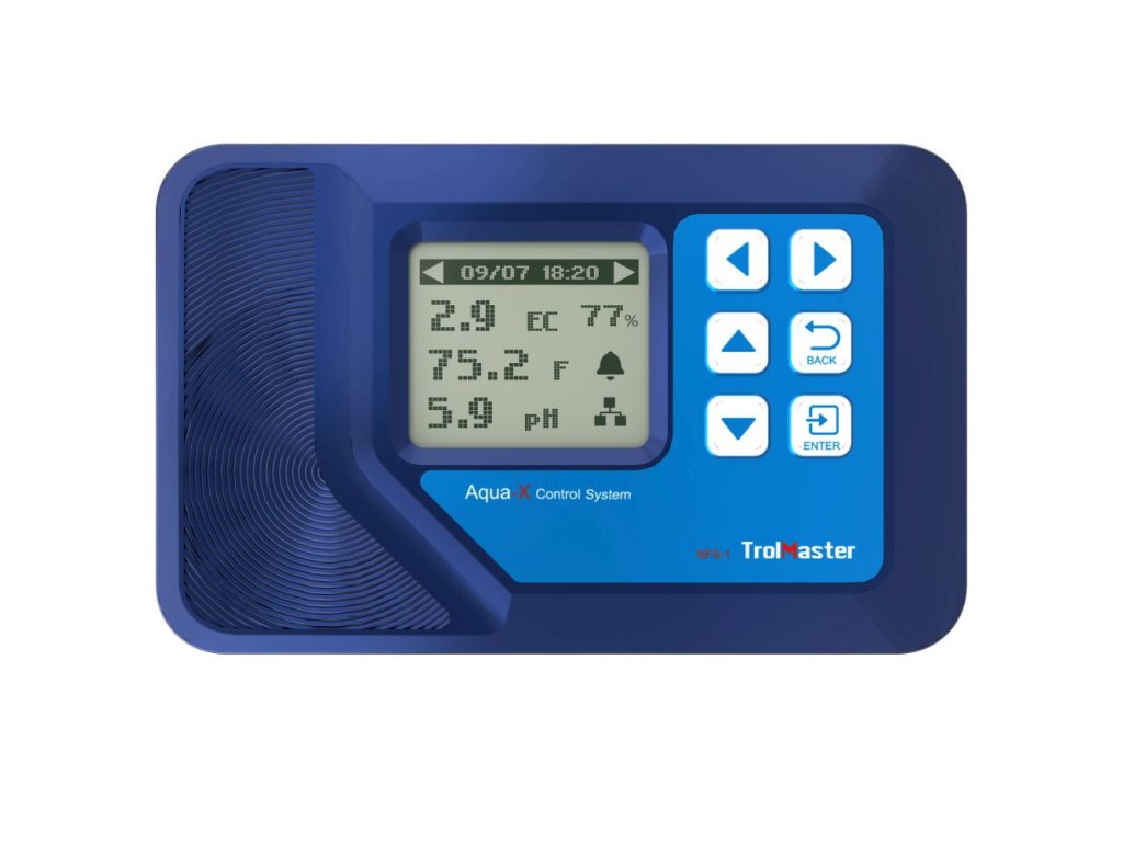 Systém Aqua-X monitoruje pH / EC a teplotu vody, stejně jako sleduje aktuální úroveň vlhkosti pěstebního média pomocí až (8) senzorů obsahu vody připojených k jediné řídicí jednotce Aqua-X.