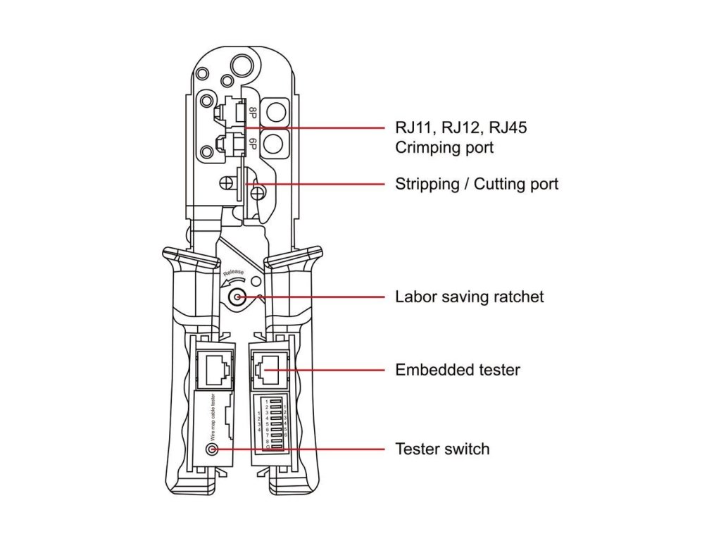 - Profesionální modulární krimpovací nástroj vše v jednom s funkcemi řezání, odizolování a testování kabelů.