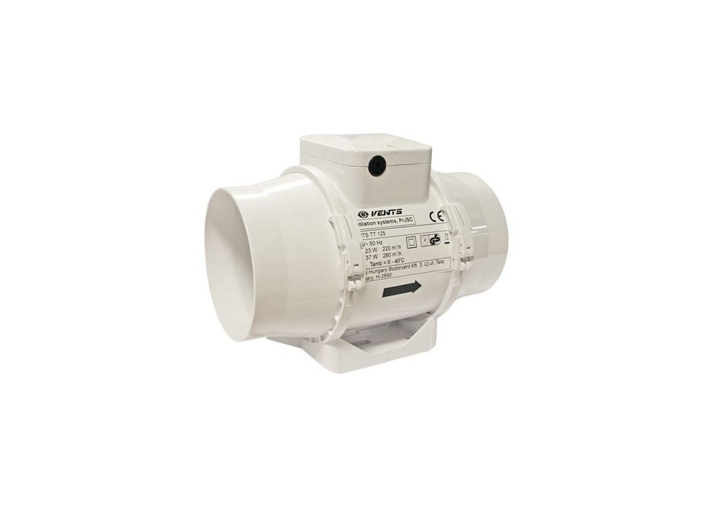 Potrubní TT ventilátor disponuje oproti základní verzi silnějším motorem, který zvládne odsát až 320 m3/h. Axiální větrák Vents TT S je vhodný pro horizontální i vertikální montáž. Plastový ventilátor s maximálním průtokem vzduchu 320 m3/h je určen pro kruhová potrubí o průměru 125 mm.