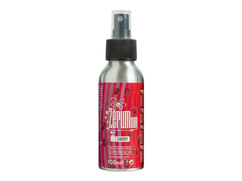 Univerzální, netoxický a účinný neutralizér zápachu Zerum CAR Třešeň, 100 ml je malý a nenápadný sprej, ideální k použití do auta. K dostání v balení po 12 nebo 100 ml a 5 vůních: lesní jahoda (Fresa silvestre), meloun a červené ovoce (Melón y frutos rojos), máta (Mentolado), neutrální (Neutro), třešeň (Cherry).